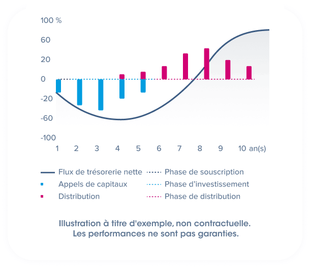 Ces produits fonctionnent par engagement, appels de fonds et distributions successives. Ce fonctionnement optimisé implique une période limitée pour honorer les appels de fonds. A la souscription, vous vous engagez uniquement sur un montant minimum de 100 000 €, aucun virement n'est demandé. Ce montant est ensuite progressivement appelé par le fonds en fonction des opportunités d'investissement. Vous avez à chaque fois une dizaine de jours pour honorer les appels de fonds. À l'issue de la période d'investissement, le fonds cède au fur et à mesure ses actifs et le produits des cessions vous est redistribué.