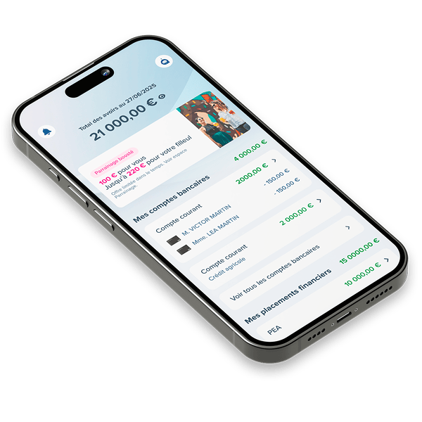 (1) Comptes à vue et certains éléments de patrimoine (comptes d'épargne, placements financiers...). Liste des établissements éligibles disponibles sur votre Espace Client.